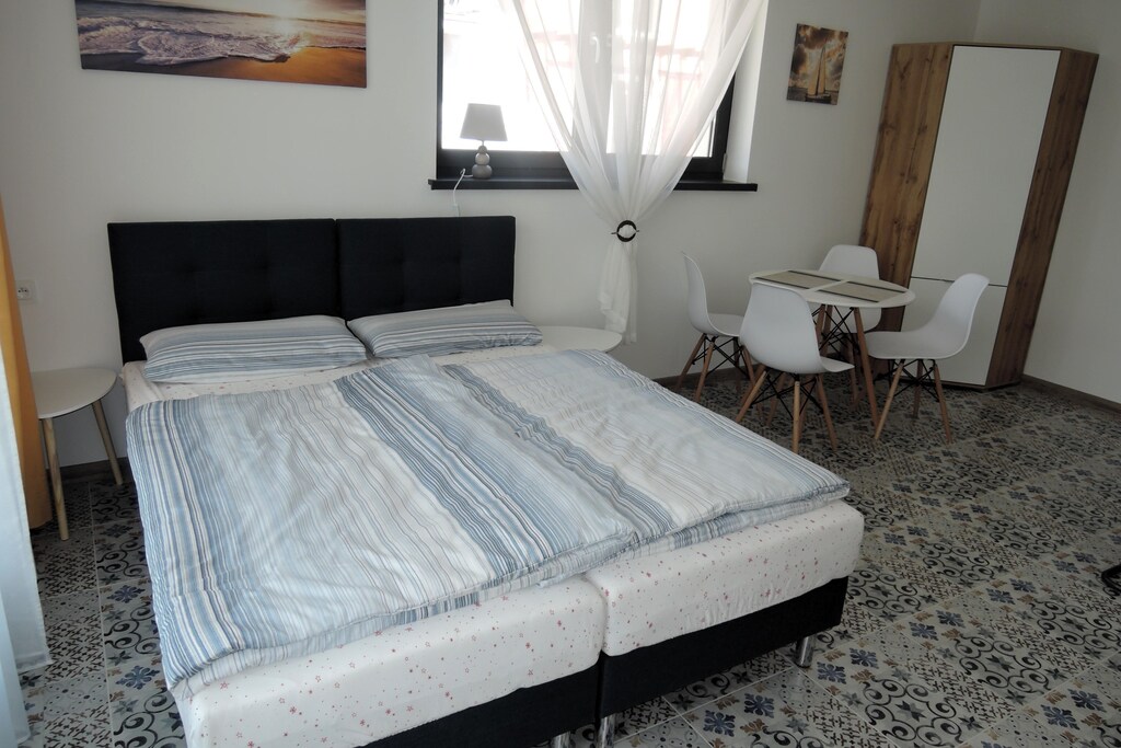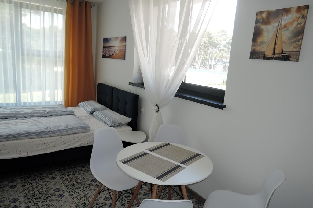 The apartment provides comfortable stay conditions, offering a spacious living room with comfortable beds, connected to an equipped kitchen, including a fridge and coffee maker, and a bathroom with a shower. An additional advantage is a large terrace (on the first floor, shared with other guests) with an area of 40 m2, from which there is a picturesque view, perfect for morning breakfasts outdoors or evening relaxation moments. Bed linen is available in the apartment. Guests also have a guaranteed parking space and broadband Internet.