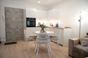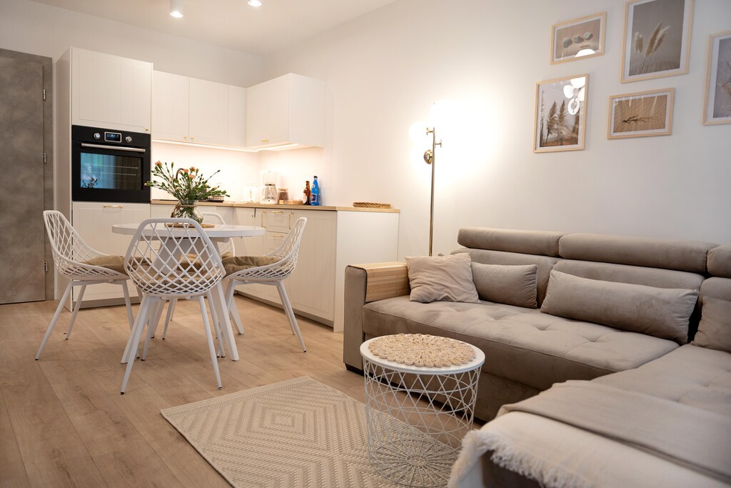 Comfortable holiday apartment on the ground floor. It has a large terrace with a set of garden furniture. The apartment consists of a living room combined with a kitchen, a bedroom and a bathroom with a shower. In the living room there is a double sofa bed, a table with chairs and a TV. The kitchen is perfectly equipped (including an oven, stove, microwave, dishwasher, coffee maker). There is a comfortable double bed in the bedroom. The apartment is equipped with a washing machine, iron, hair dryer. There is a large balcony. Central heating. Wireless internet available.