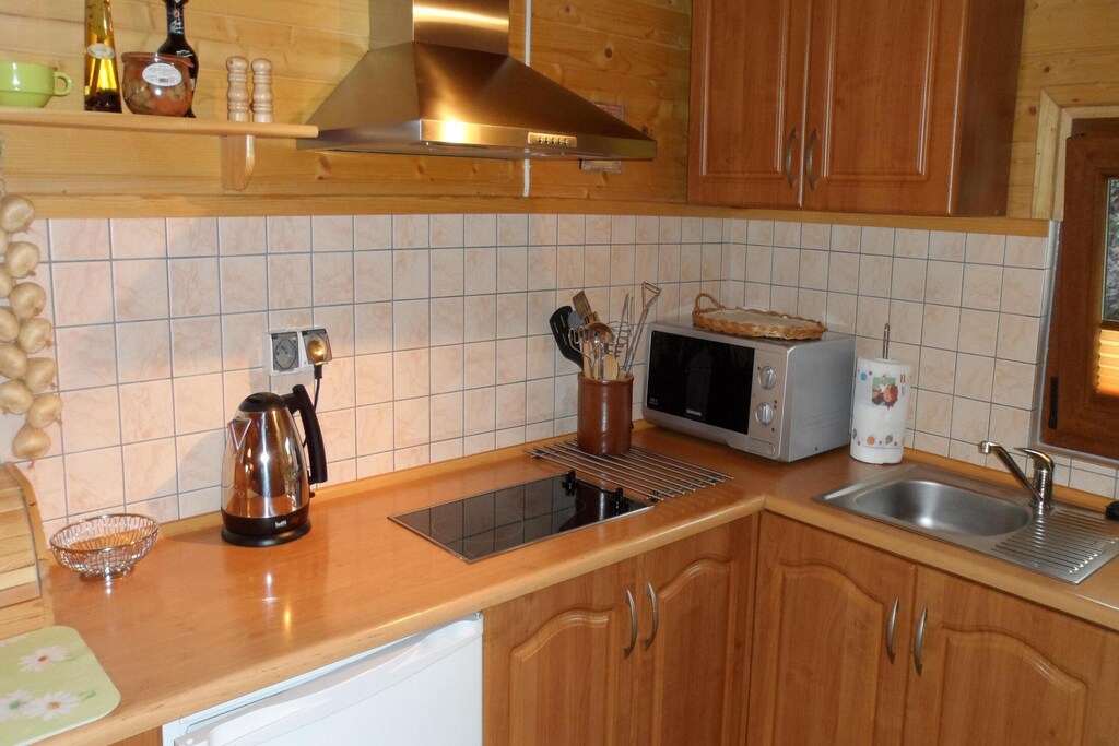 Hob (electric, 2 ring stoves), Electric kettle, Toaster, Hood, Coffee machine, Microwave, Dishwasher, Fridge-freezer