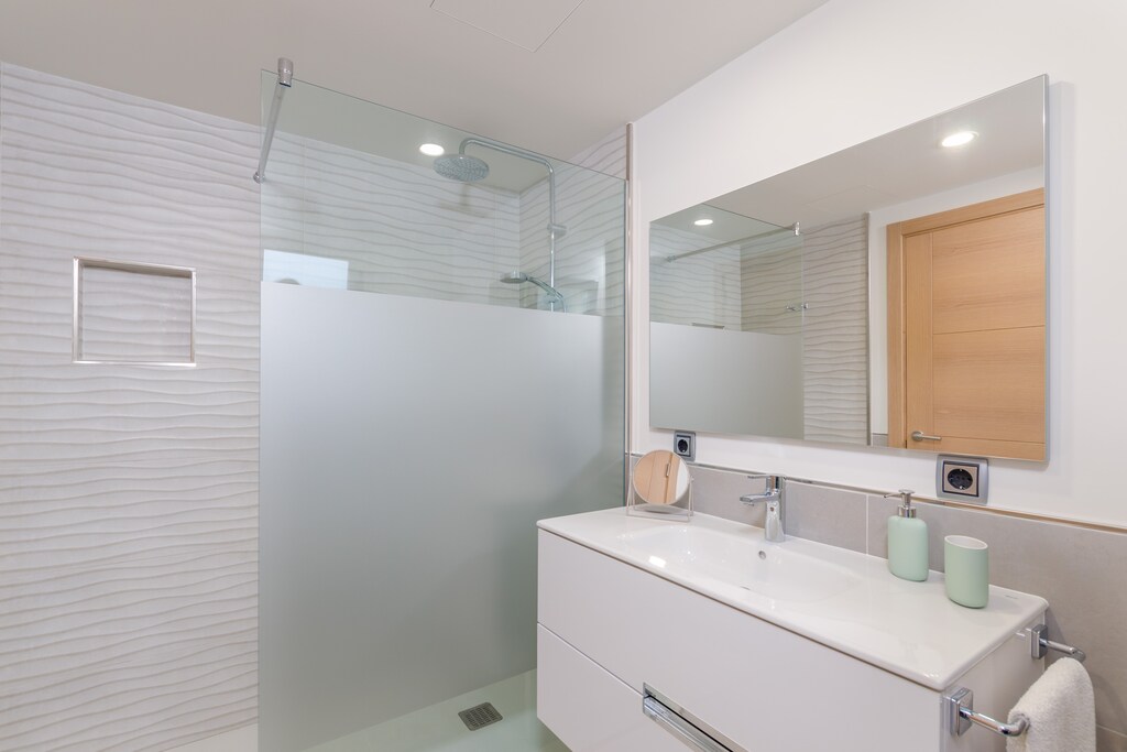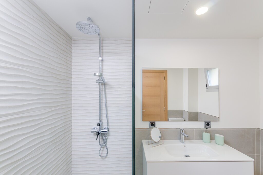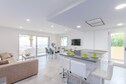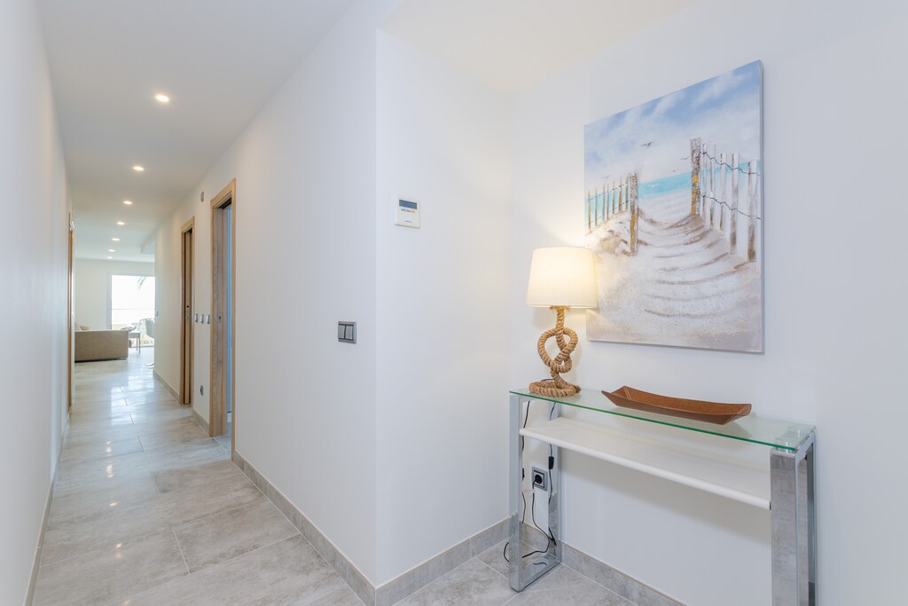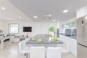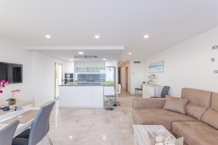 The inside of this apartment boasts luxury and modernity, as well as spacious rooms such as the impressive living-dining-kitchen. This space becomes a very functional place because you can chat or watch satellite TV while cooking or enjoying your meals. The kitchen area is independent and it offers a ceramic top on a fantastic island with stools as well as an oven, microwave and much more. The laundry room is independent and it has a washing machine, an iron and an ironing board. A beautiful corridor leads to the shower bathroom and the 3 bedrooms. All of them feature a closet. One has a double bed and en-suite shower bathroom, and the other two present two twin beds each. A cot and a high chair are available on request. Finally, the whole accommodation is equipped with ducted air-conditioning.