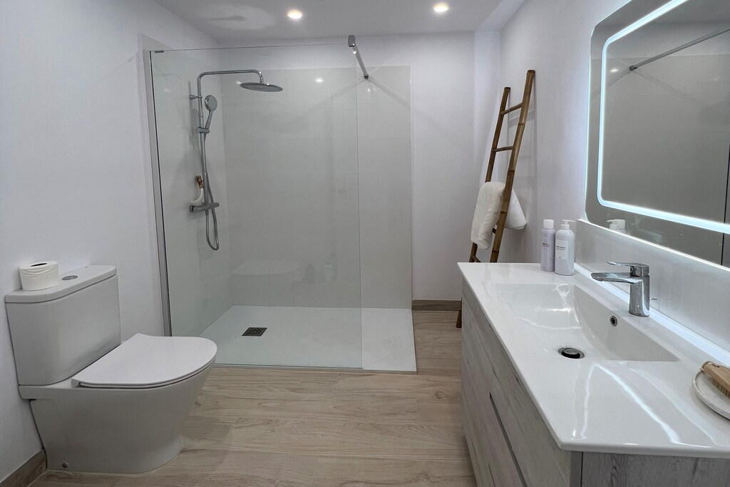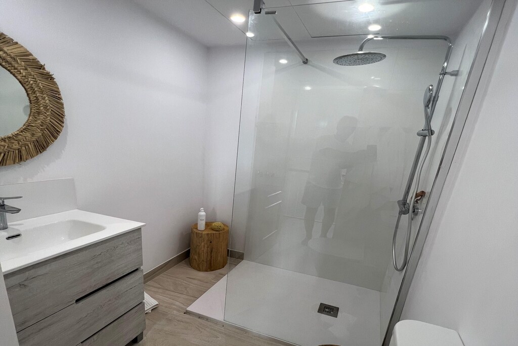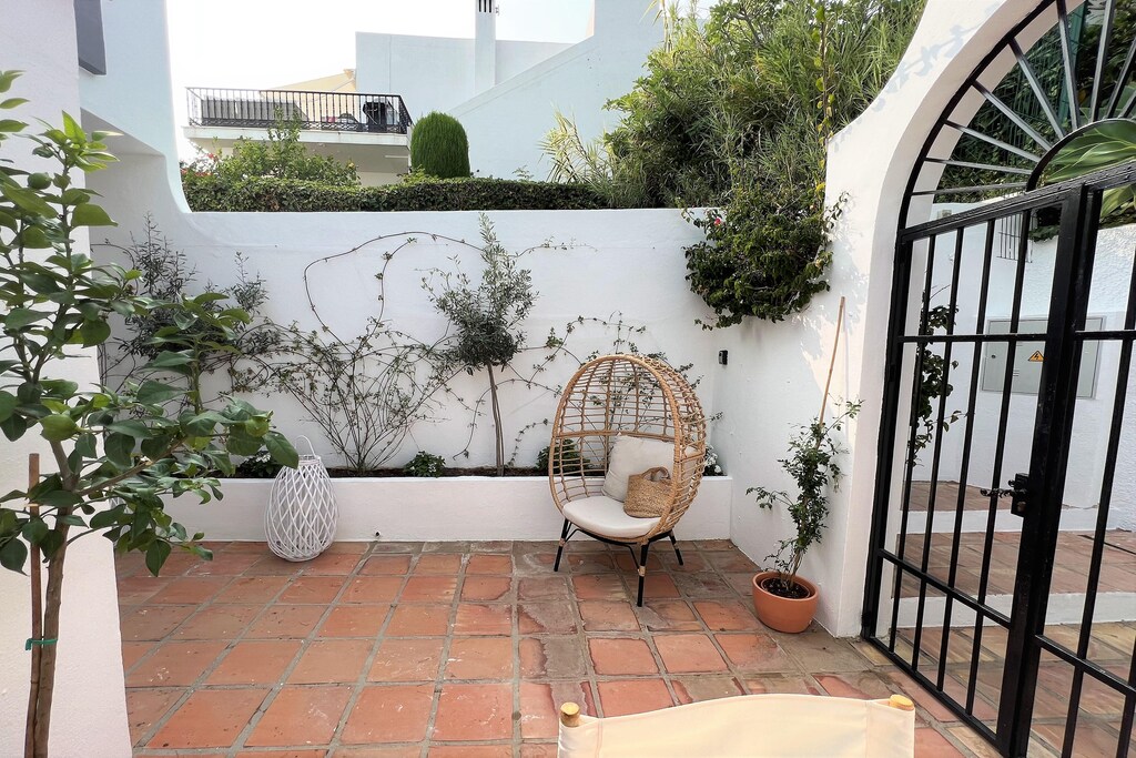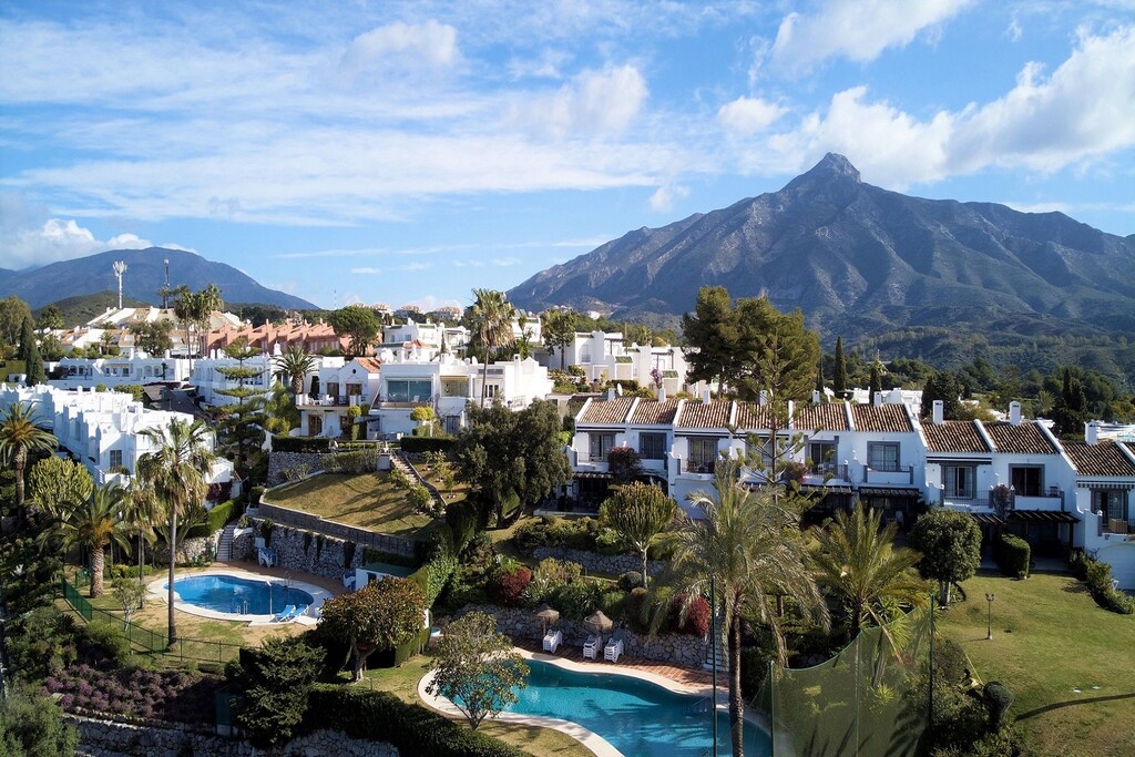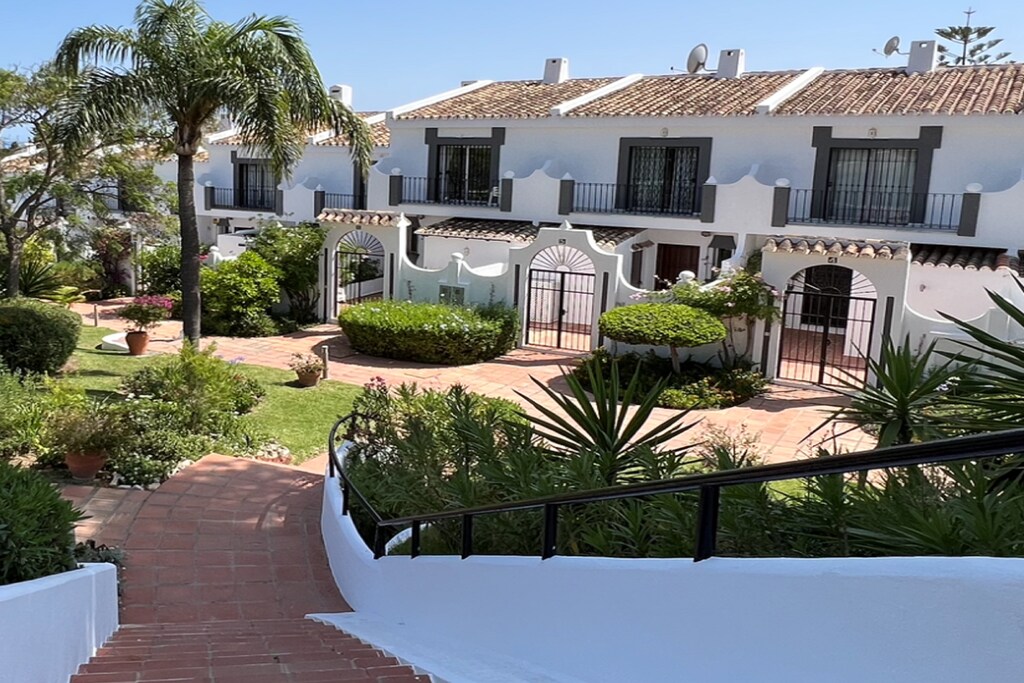 The house is south-facing, has lovely outside space with a large veranda with outdoor furniture and a gas barbecue, a large terrace off the master bedroom with both pool and mountain views and a side sea view, and there is a private courtyard entrance. There is a shared tropical garden and secluded swimming pool as well as a tennis court.