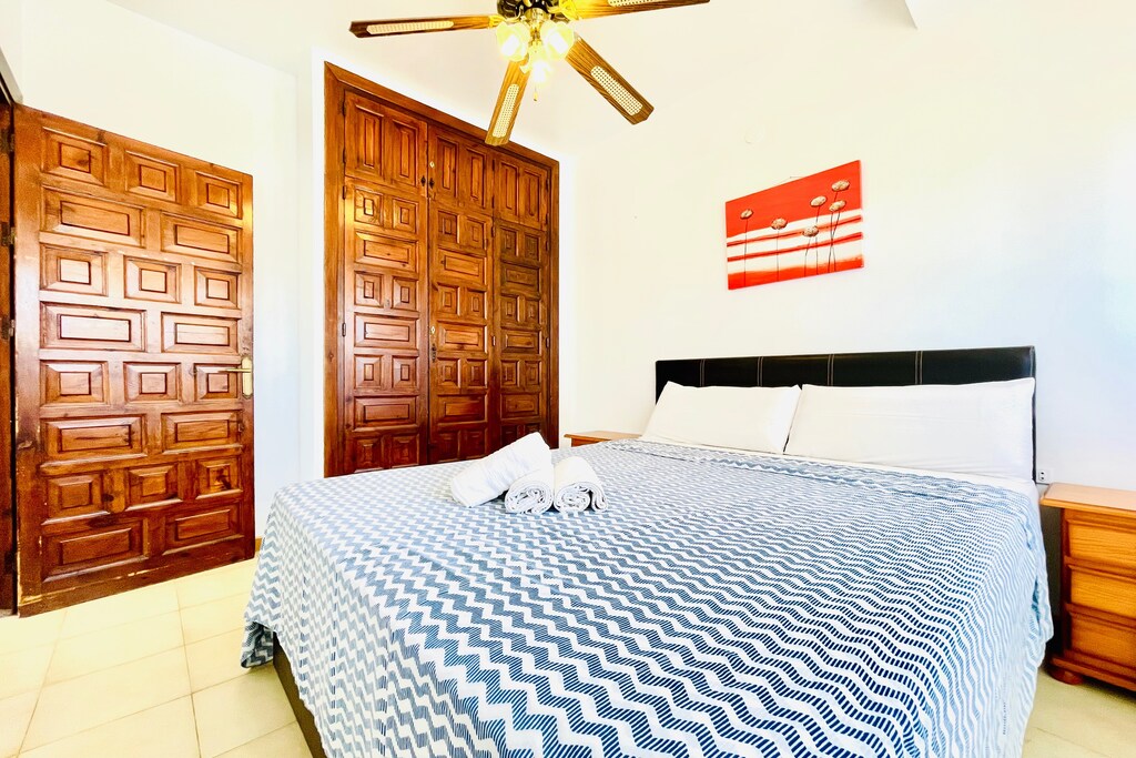 Inside, the home features a spacious living room with a comfortable sofa bed for an additional guest, a fully equipped kitchen, and a modern bathroom. Air conditioning ensures a cool and pleasant stay during the warm Spanish summer.