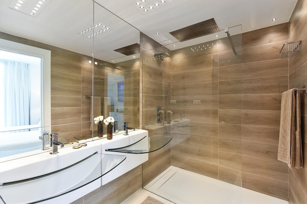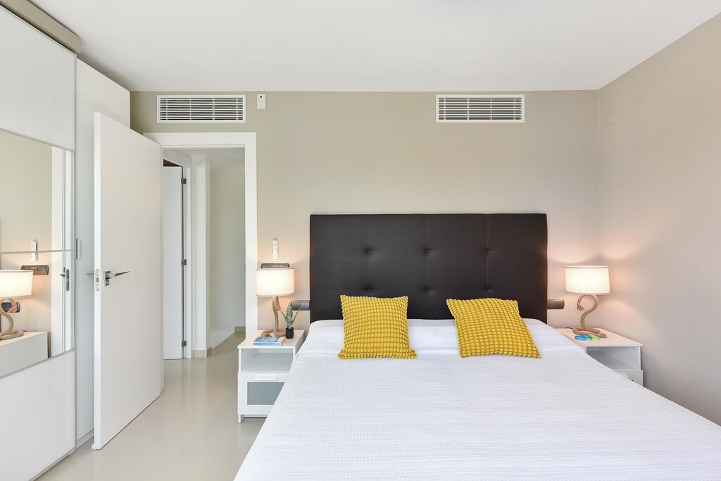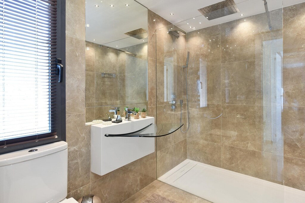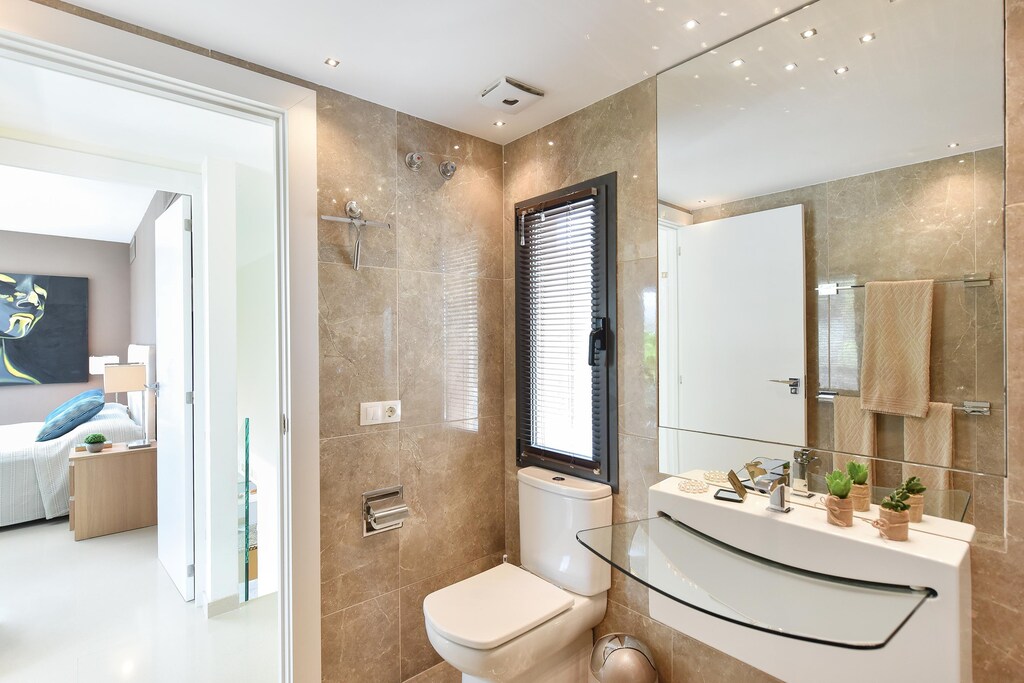 This villa has three spacious bedrooms, one of them is on the ground floor with a view of the garden, a double bed and a bathroom with shower. The master bedroom on the upper floor is equipped with a double bed, large windows that provide plenty of natural light and views over the golf course and access to a small private terrace/solarium.