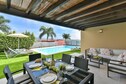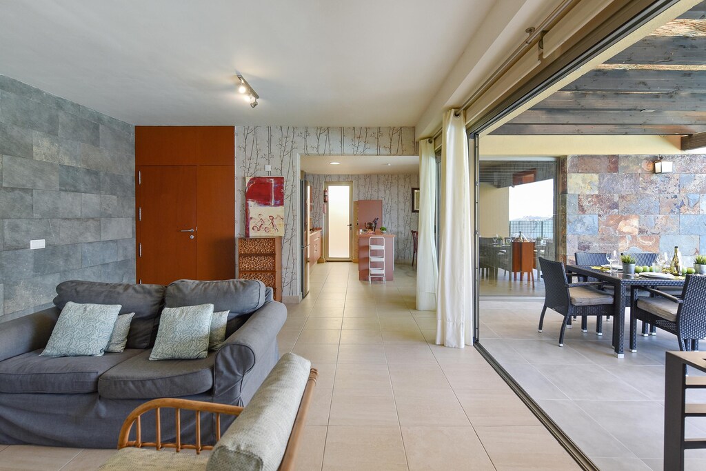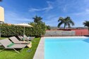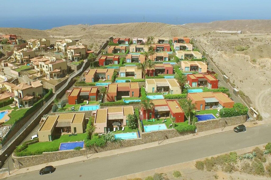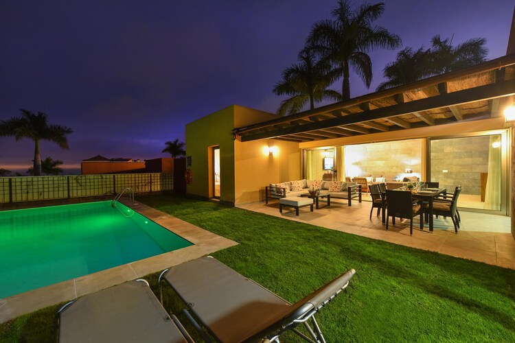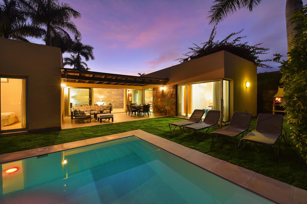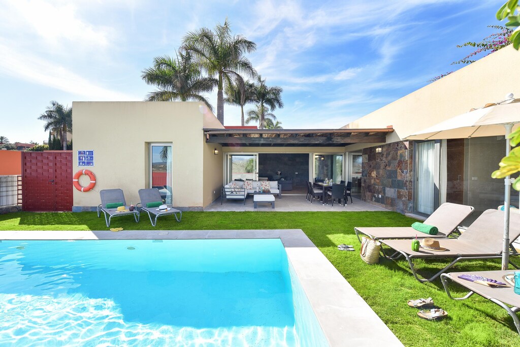 The villa with its modern but cozy decor ensures that you feel right at home. Relax on the large terrace with several seats and sun loungers overlooking the garden and the private swimming pool of 8 x 4 m. Enjoy a barbecue in the afternoon and see how the sun undergoes above the mountains! Be pampered by the daily bread delivery service. This exclusive residential complex on the edge of the golf resort originated in a unique landscape in the mountains of Maspalomas. In the immediate vicinity you can do daily shopping in the supermarket and in a restaurant you will be spoiled culinary. The popular tourist centers of Maspalomas and Playa del Ingles can be reached in less than ten minutes by car. Guests of the villas can use the North and South Golf course. The South Golf Course (18 holes) has a par of 71 strokes over a length of 6.112 m, the north (18 hole) golf course has a length of 5,524 m and a par of 72 strokes. Villagasts receive a green fee discount.