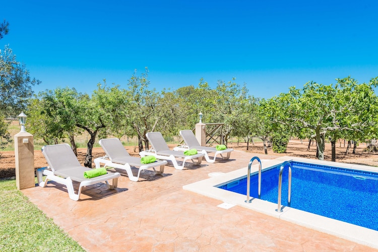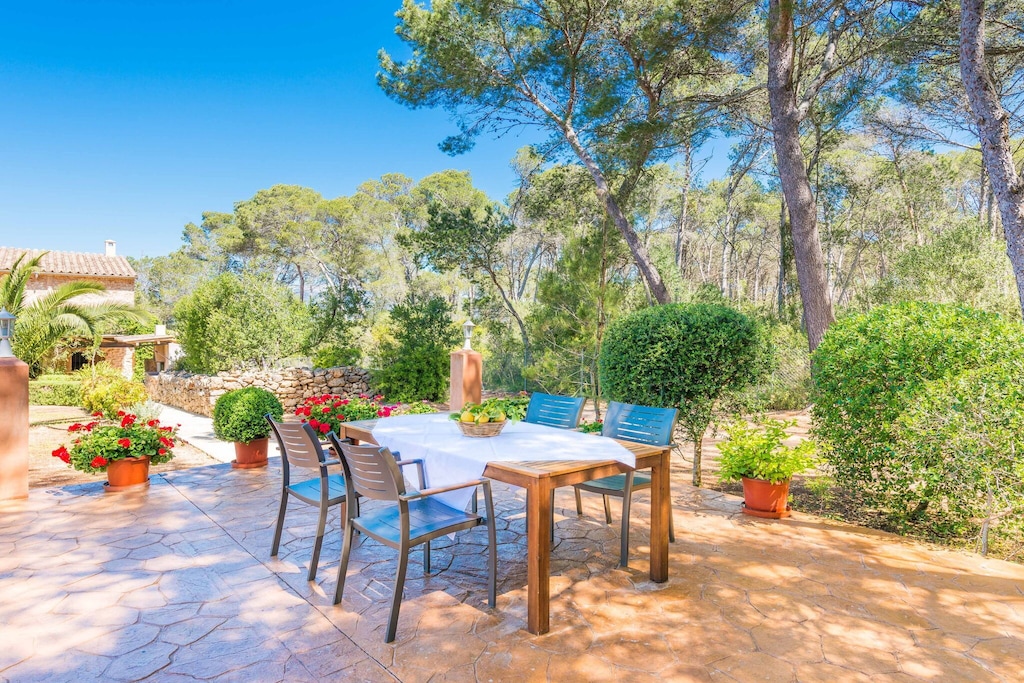 The 250m2 house is lined typically with Mallorcan stone, wooden beams and wooden furniture on the outside, and the Mallorcan style continues on the inside, combining modern furniture with typical elements from the island. On the ground floor there is a spacious, luminous living- and dining room, with comfortable sofas, satellite television, air conditioning, a wood stove and a rustic dining table for 8. The independent kitchen works with a vitro hob and counts with all necessary utensils to prepare your favourite dishes during your stay. It has direct access to the porch. Two of the four bedrooms are situated on the ground floor: one of them counts with a double bed and the second bedroom counts with 2 single beds and an en-suite bathroom with a shower. There is another bathroom on the ground floor, with a bathtub, for general use of the house. The other two bedrooms are situated on the first floor: one with a double bed and one with two single beds. All bedrooms count with a wardrobe and air conditioning. There is a third bathroom with a bathtub on this floor, for general use. The house counts with a washing machine, an iron and an ironing board. On request, we can prepare a babybed and a high chair, without any additional cost.