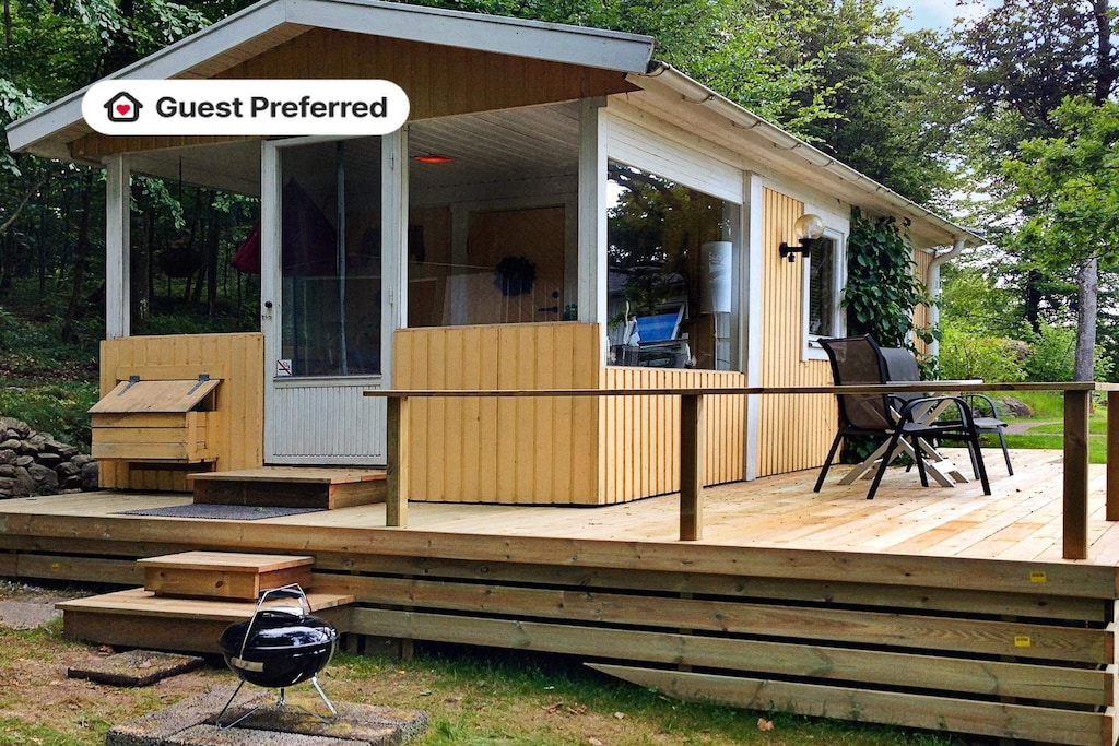 Welcome to this small, high-rise cottage with magnificent views over lake Finjasjön. This cosy cabin consists of a combined kitchen/ family room and a glazed terrace. For the little family of two, this little cabin has everything that is needed and everything is new. The kitchen is open-plan and features the necessary amenities. In the bathroom you will find a WC, a washbasin, and a shower. The cottage has a comfortable sofa bed and internet. There is a large patio as well as equipment to enjoy a lovely barbecue should you so desire. The included rowing boat is not available during the period 08/10 - 20/05. For those who enjoy golf, Skyrups golf course is close. There are good bathing facilities in Finjasjön. A rowing boat is included in the rent, so why not use it to explore the lake? Also within the area, are plenty of forests and opportunities for lovely countryside walks. In Hässleholm, you will find shops and an active nightlife. The popular Tykarps Cave, a 10,000-square metre, underground terrain labyrinth is a wonderful destination for a day trip. For wine lovers, Fredholm's vineyard in Tyringe is an exciting destination. Welcome!
