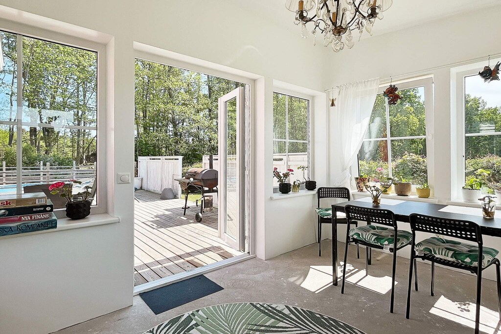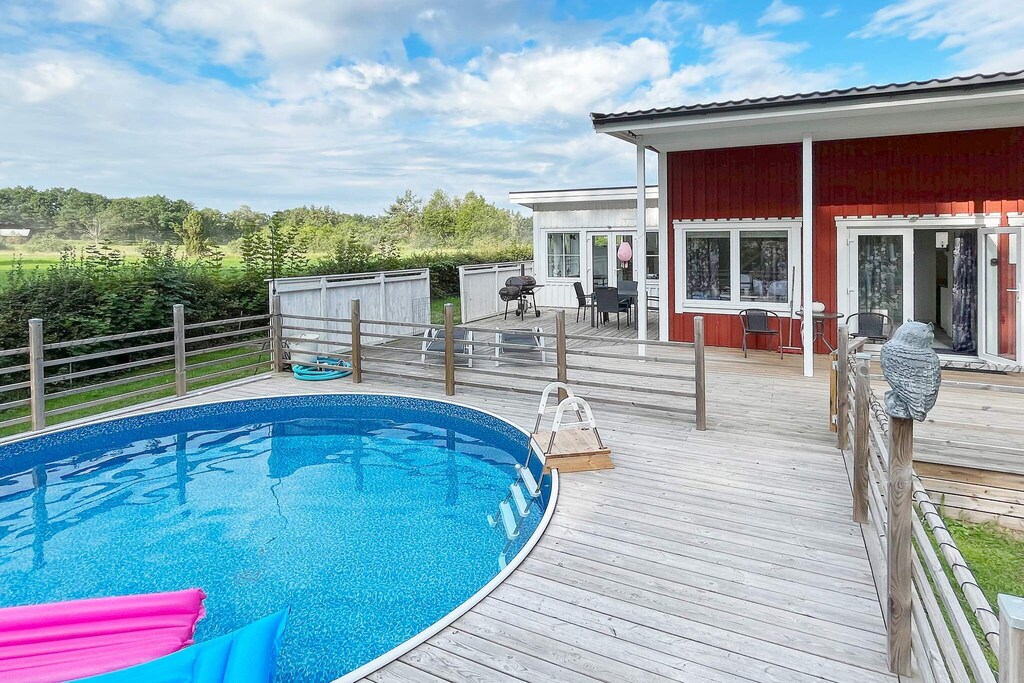 Fantastic house in top condition with a pool, where you can really enjoy the tranquility of the countryside while you are only two kilometers from Kalmar's great selection and city pulse. Here you have a lovely back garden and terrace with a completely private location and scenic surroundings with a view of the forest, the open field and the river that so beautifully surrounds the plot in two directions. Here is also the pool where you can cool off. There is a lovely glazed conservatory you can enjoy well into the evenings. The house has an open floor plan with a kitchen where you have a combined oven/microwave, induction hob, fridge, freezer, coffee maker and a small dishwasher. You have a beautiful dining area with a view of the pool. The bedroom is truly something out of the ordinary with privacy-protected glass sections on both sides of the bed and a patio door. You have a nice bathroom with toilet, sink, shower cubicle and a combined washing machine/dryer. Upstairs is the small living room with a low ceiling where you have a comfortable sofa that can be made into a 120cm bed and a large TV with chromecast. The plot is fenced, which means you can let your dogs free if you so wish. Cats not welcome. The pool is not heated. You have only 10 km to the coast with a string of lovely bathing beaches. Kalmar has a large range of culture, restaurants, events and shopping. Here is the beautiful Kalmar Castle that you must not miss. Also a day trip across the bridge to the island of sun and winds Öland is highly recommended. Good fishing can be found in Snärjebäcken's fishing waters 5.6 km away, where you can buy a fishing license to fish for rainbow salmon, roach, perch and pike. Also enjoy the wonderful nature, there are plenty of walking paths.